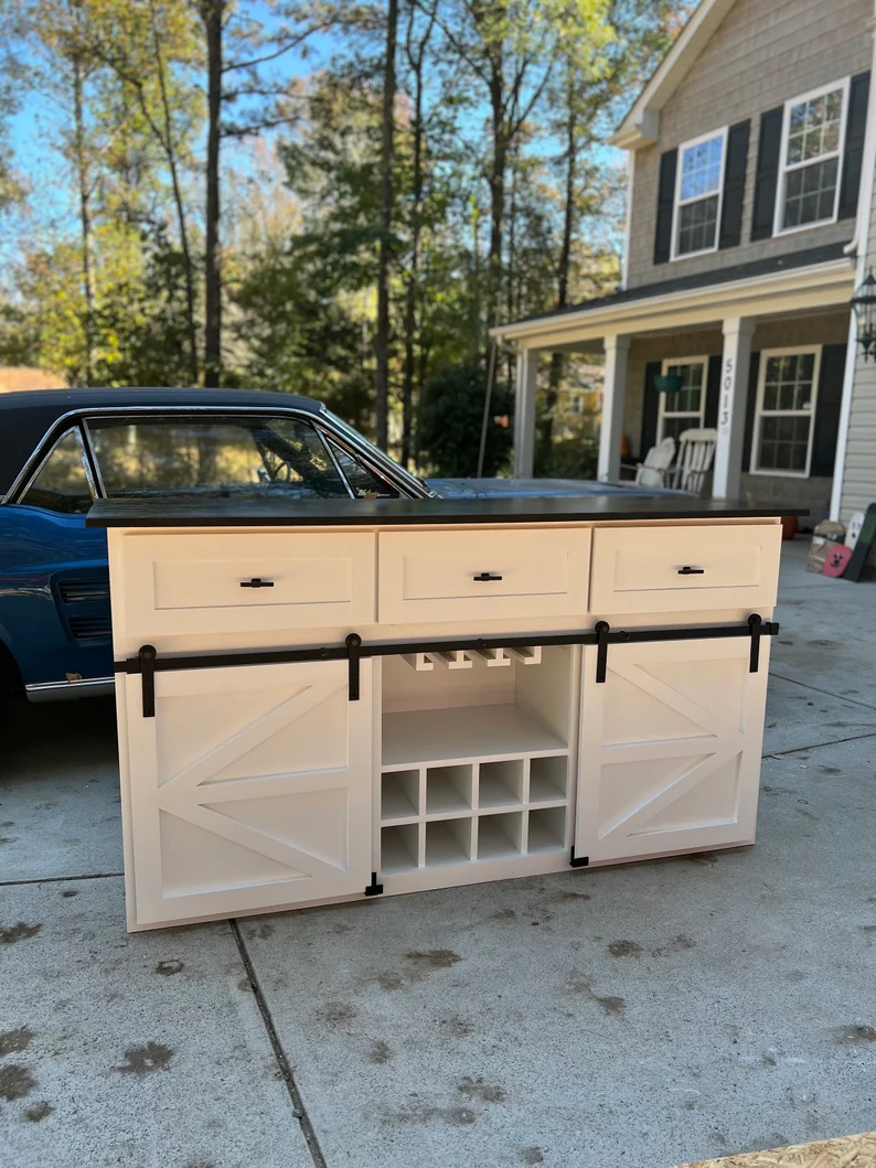 Wine Lovers!! Spruce up your morning cup of java with this one-of-a-kind coffee bar! It’s beautiful and multi functional! This Wine Bar is customizable according to your exact dimensions as well as your choice of finish to include paint and/or stain! The measurements for the pictured item are 60″ L x 20” D ” 40” H. Equipped with a built in winerack. wine cubbies with a hanging wine glass holder and cabinets on each end. Customized to fit your needs based off dimensions. Additional charges for larger pieces and fridges may occur, as well as $30 charge for custom paints. Main photo is equipped with a White painted frame and true black stained top, also customizable to your liking!