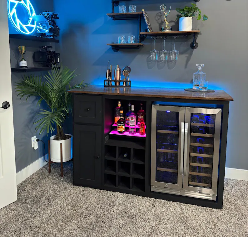 Coffee Lovers!! Spruce up your morning cup of java with this one-of-a-kind coffee bar! It’s beautiful and multi functional! This console coffee bar/ Wine Bar is customizable according to your exact dimensions as well as your choice of finish to include paint and/or stain! The measurements for the pictured item are 60″ L x 20” W ” 38″ H. Equipped with a built in winerack. Your choice of either wine cubbies or X winerack. Wine cubbies default to 3×3 for standard fridge. 4×3 for wine fridge width under 15”. If nothing is selected, it will be built with an X winerack and left facing fridge. Customized to fit your needs based off dimensions and your mini fridge / wine fridge. Additional charges for larger pieces and fridges may occur. Main photo is equipped with a White painted frame and espresso stained top, also customizable to your liking! if no fridge specs sent, height will vary depending accommodate most fridge sizes.